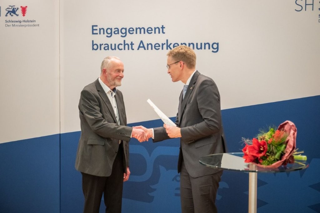 Ministerpräsident Daniel Günther überreicht unserem Sprecher Norbert Meinert für sein langjähriges Engagement als 1. Vorsitzender des Vereins der Freunde und Förderer des Detlefsen-Museums die Ehrennadel des Landes Schleswig — Holstein.
